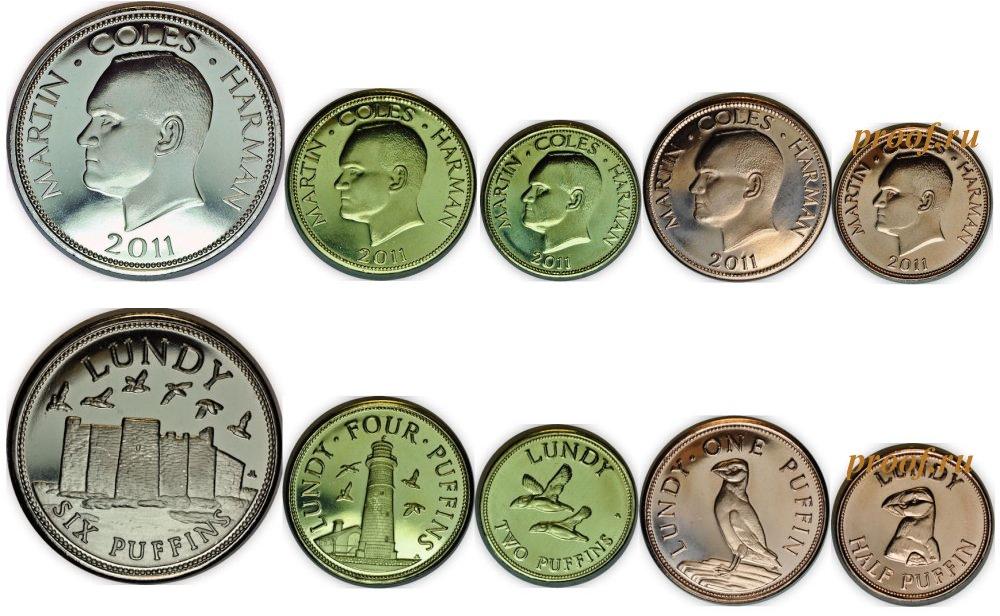 Набор из 5 монет: 1/2, 1, 2, 4 и 6 паффинов. Монеты самого большого острова в Бристольском заливе с населением 28 человек. Е-1158