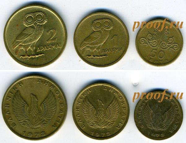 Набор из 3 монет: 50 лепта, 1 и 2 драхмы. Филин. Е-1205