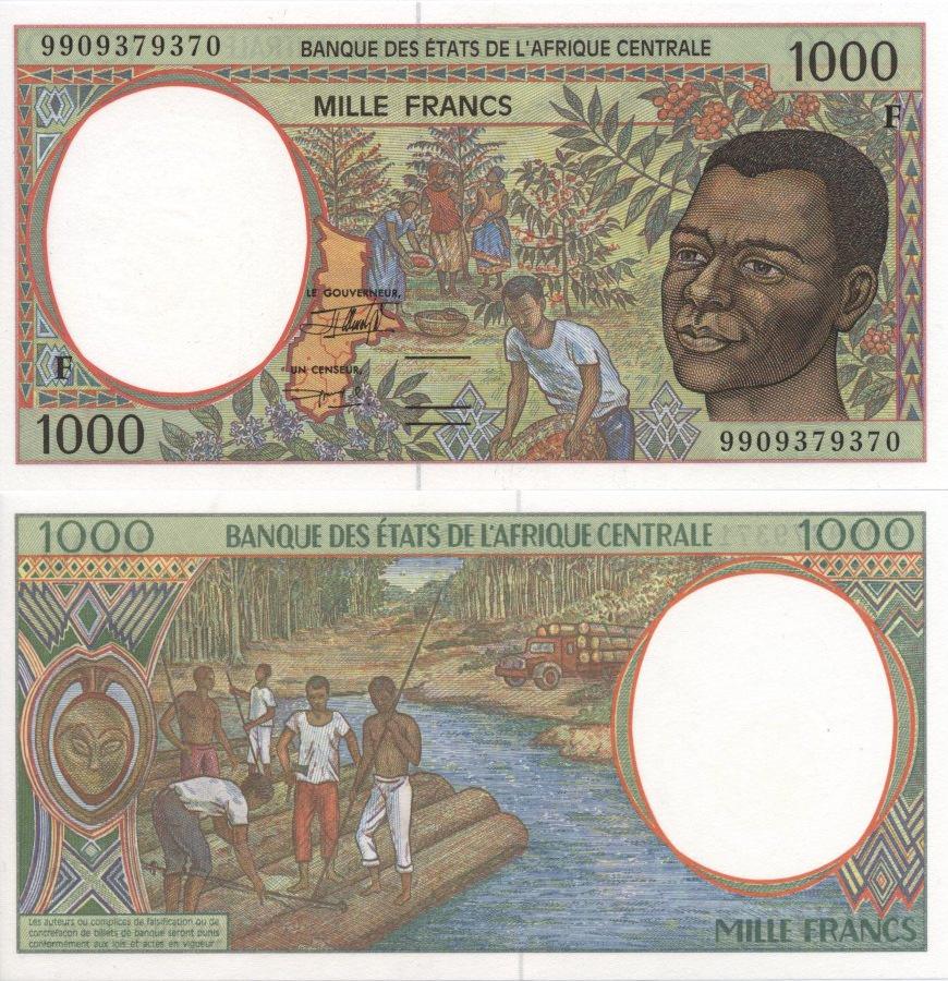 Сбор кофе. Плот, вырубка леса. Банкноты Центральноафриканского валютного союза с буквой "F", означающей Центральную Африканскую республику