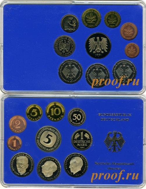 Годовой набор из 10 монет: 1, 2, 5, 10, 50 пфеннигов, 1, 2, 2, 2, 5 марок с 1979 по 1993год. ПРУФ